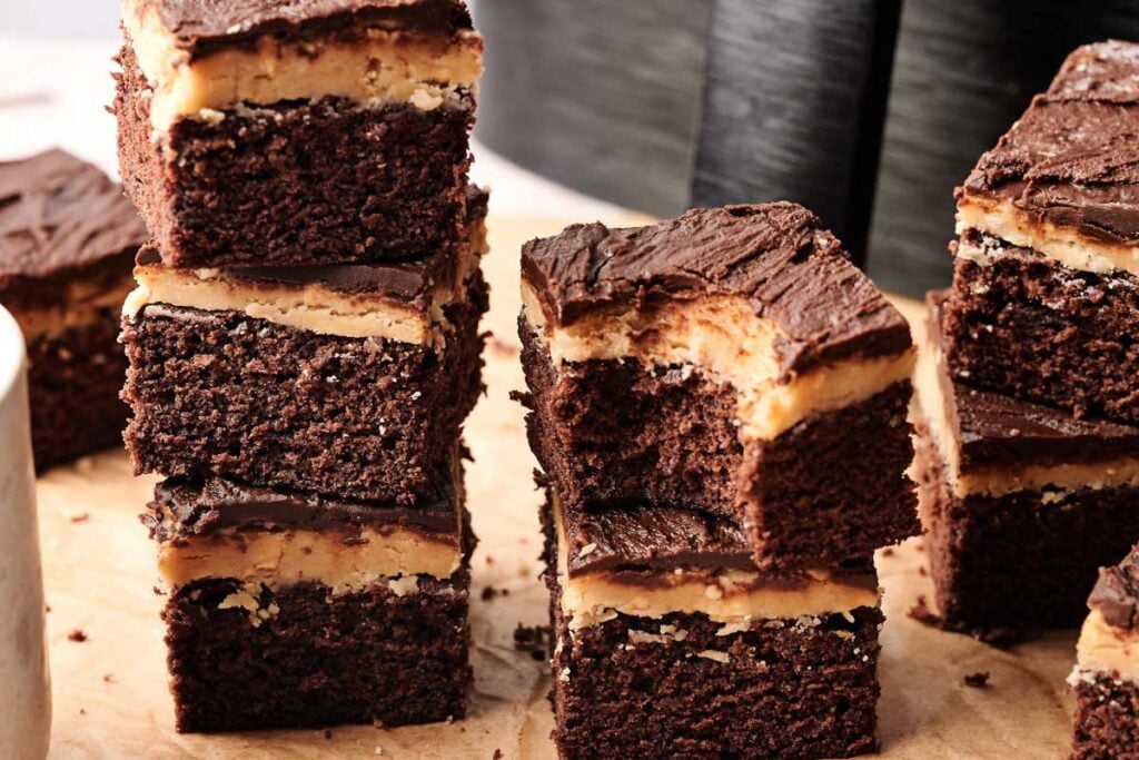 Cool completely in the pan, or let the brownies cool slightly for a few minutes before carefully transferring to a cooling rack to finish cooling using the parchment overhang. Rushing this step will cause the peanut butter layer to slide right off, so be patient here.