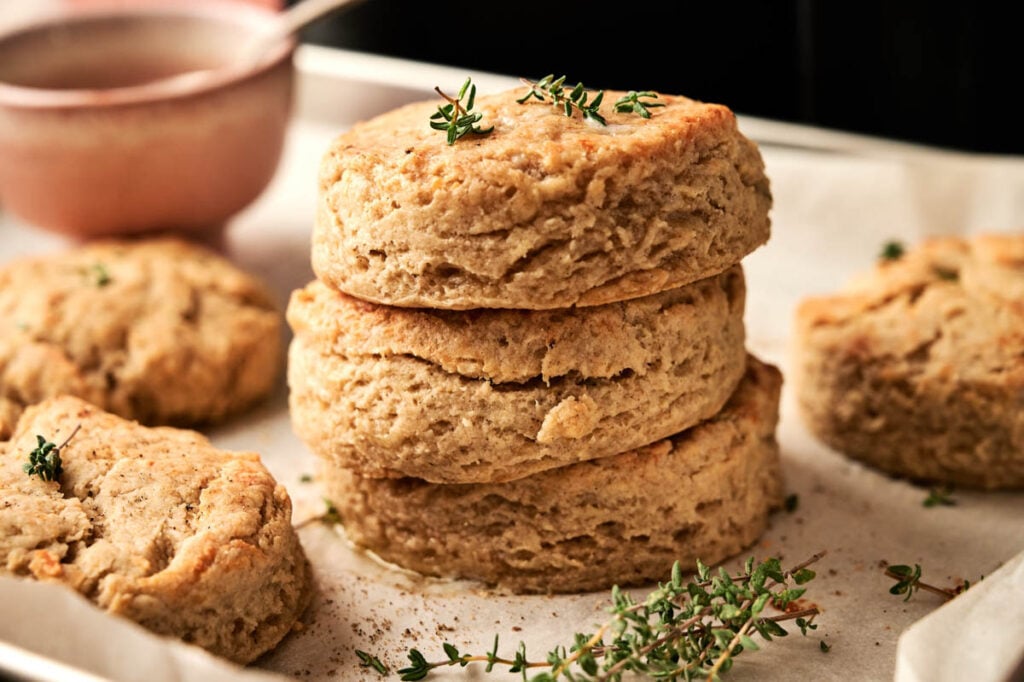 These biscuits are perfect alongside soups and creamy chowders, from potato and chicken pot pie to classic tomato bisque. The sharp cheddar and thyme make them versatile enough to serve anywhere you’d normally use a dinner roll.