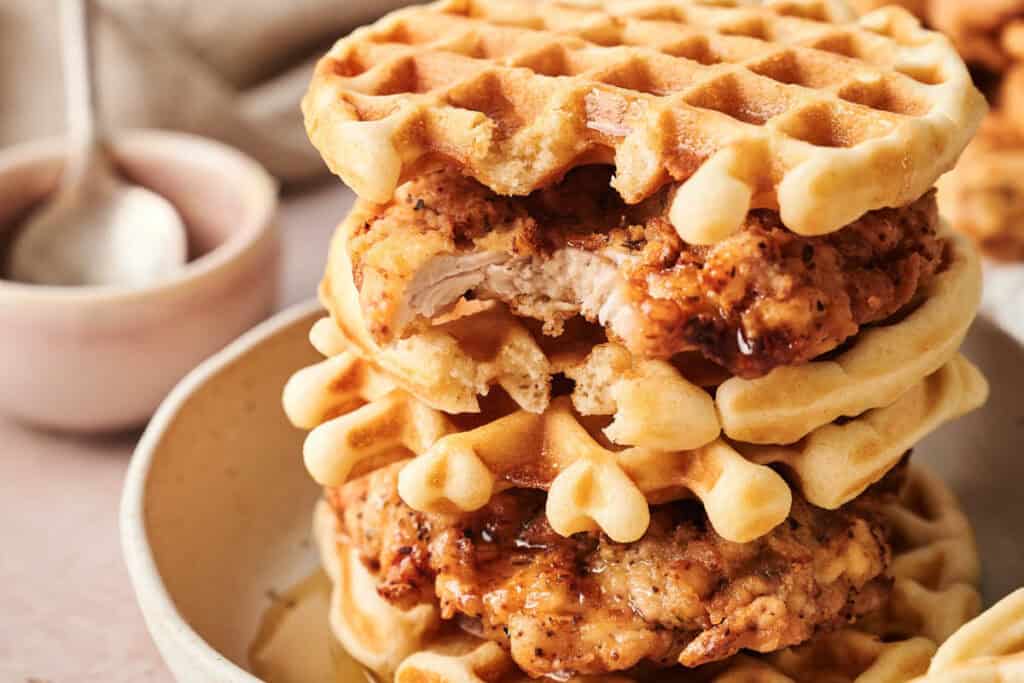 If you’re bringing this to a potluck, it’s best to keep the waffles and chicken in separate containers so they don’t arrive soggy. A hard-sided container protects waffles from getting squished while you’re on the go, and an insulated carrier keeps the chicken hot and crispy until you’re ready to assemble and serve.