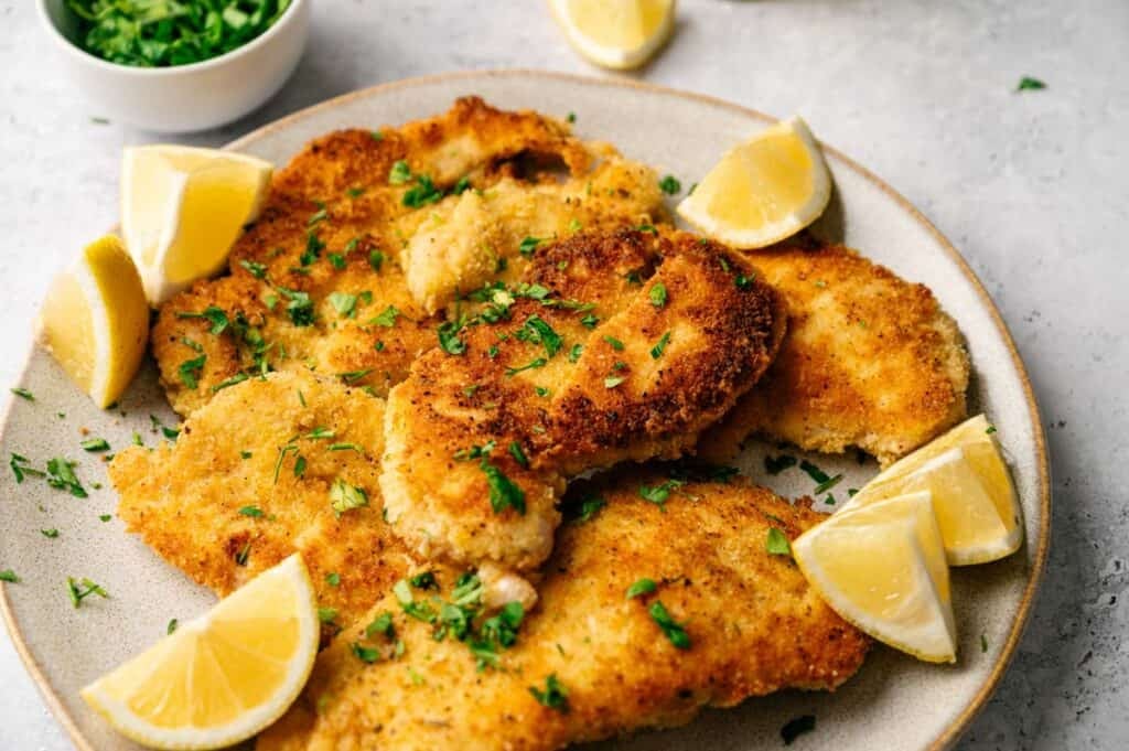 A plate of crispy chicken cutlets, breaded and fried to perfection, garnished with chopped herbs and served with fresh lemon wedges.