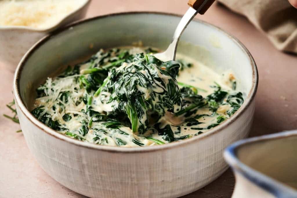 Creamed spinach pairs perfectly with seared steak, baked chicken, roasted turkey, or even grilled salmon. It also works well as part of a vegetarian plate alongside mashed potatoes, roasted carrots, or a simple pasta dish.