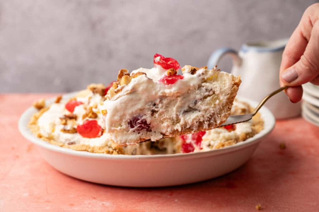 Garnish with extra maraschino cherries and pecans on top. Let it sit at room temperature for about 45 minutes to an hour so it’s soft enough to slice cleanly but still frozen and creamy. Serve and enjoy!